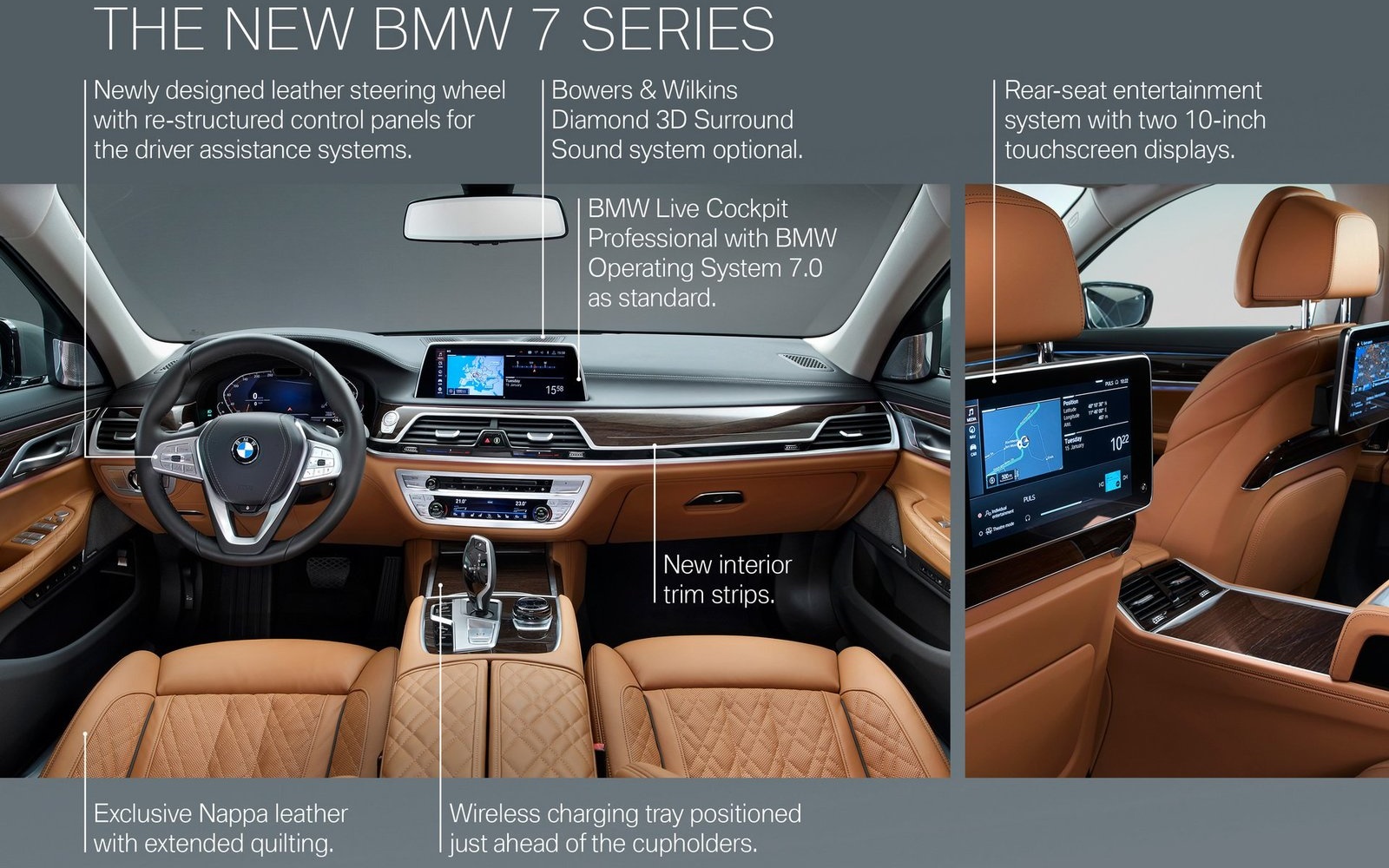 Novi su i multifunkcionalni volan i infotejnment sistem. Kada je reč o multimediji, novi BMW Serije 7 je dostupan sa najnovijim operativnim sistemom bavarske kompanije, 7.0. On kombinuje digitalnu instrument tablu veličine 12,3 inča sa ekranom osetljivim na dodir veličine 10,25 inča. Tu je i opcija “Intelligent Personal Assistant”. Putnici na zadnjoj klupi će moći da uživaju u multimedijalnom sadržaju zahvaljujući ekranima dijagonale 10 inča koji su montirani na sedišta ispred njih.