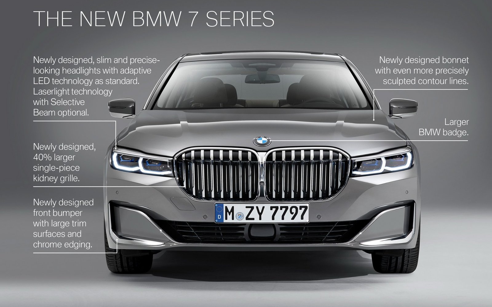 Najpre, da krenemo od onoga što svima “bode oči”. Reč je naravno o masivnoj maski (rešetki) hladnjaka. Ona je za 40% veća od maske kod prerestilizovanog modela. Po mišljenju svih, upravo ta maska je najkontroverznija promena na modelu Serije 7.
