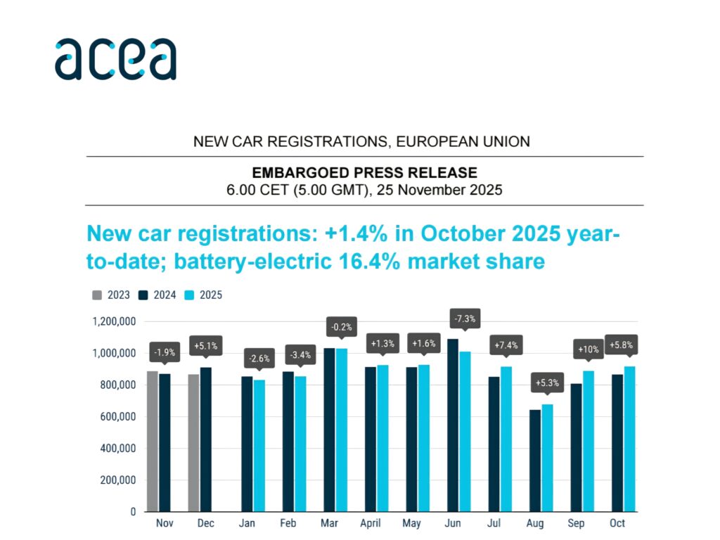 Tržište novih automobila u Evropskoj uniji beleži blagi oporavak. U periodu januar-oktobar 2025. godine registrovano je 1,4% više automobila nego u istom periodu prošle godine, što predstavlja četvrti mesec uzastopnog rasta. Ipak, ukupni obimi i dalje ostaju znatno ispod nivoa od pre pandemije.