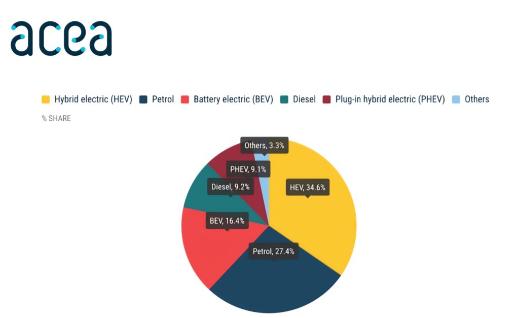 Najpopularniji pogonski sistem u EU i dalje su hibridna vozila. Do kraja oktobra registrovano je 3.109.362 hibrida, čime ovaj segment osvaja 34,6% ukupnog tržišta.