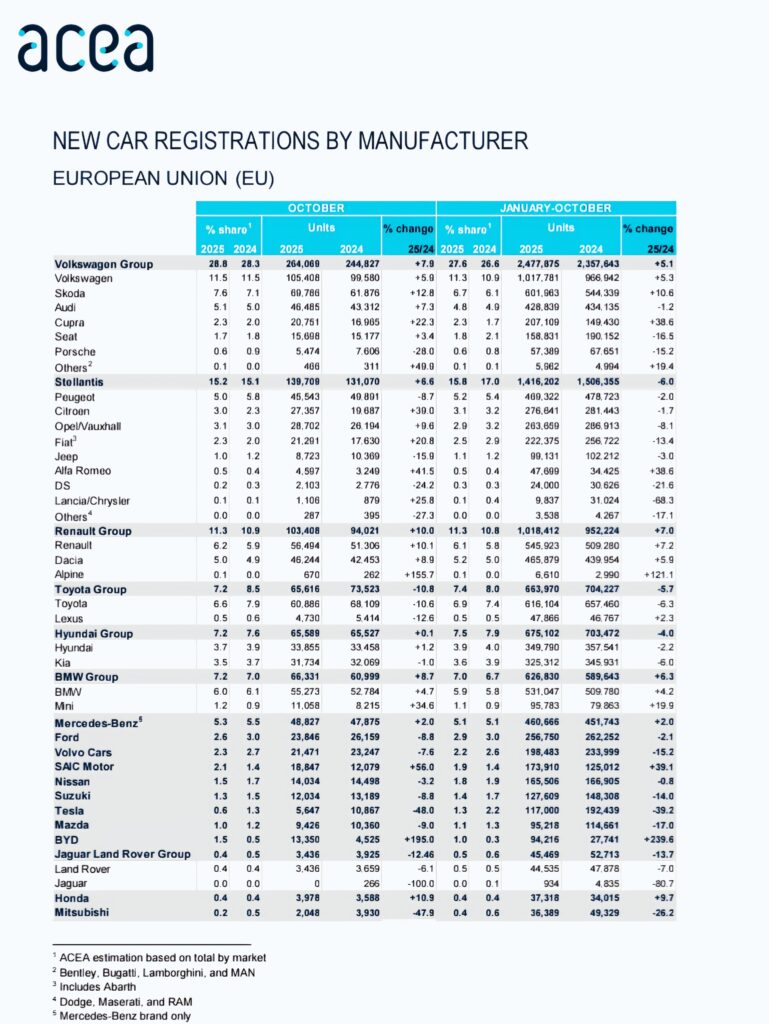 U oktobru Mazda na tržištu EU isporučila 9.426 automobila dok je VW plasirao 105.000 primeraka Renault 60.000. Kineski SAIC sa 18.847 i BYD 13.350 primeraka najavili budućnost. Toyota iako u procentualnom padu, još uvek sa 60.000 drži korak . Veliki rast Renault Grupe (+10%). Koreanci potpuno zaustavljeni u rastu.