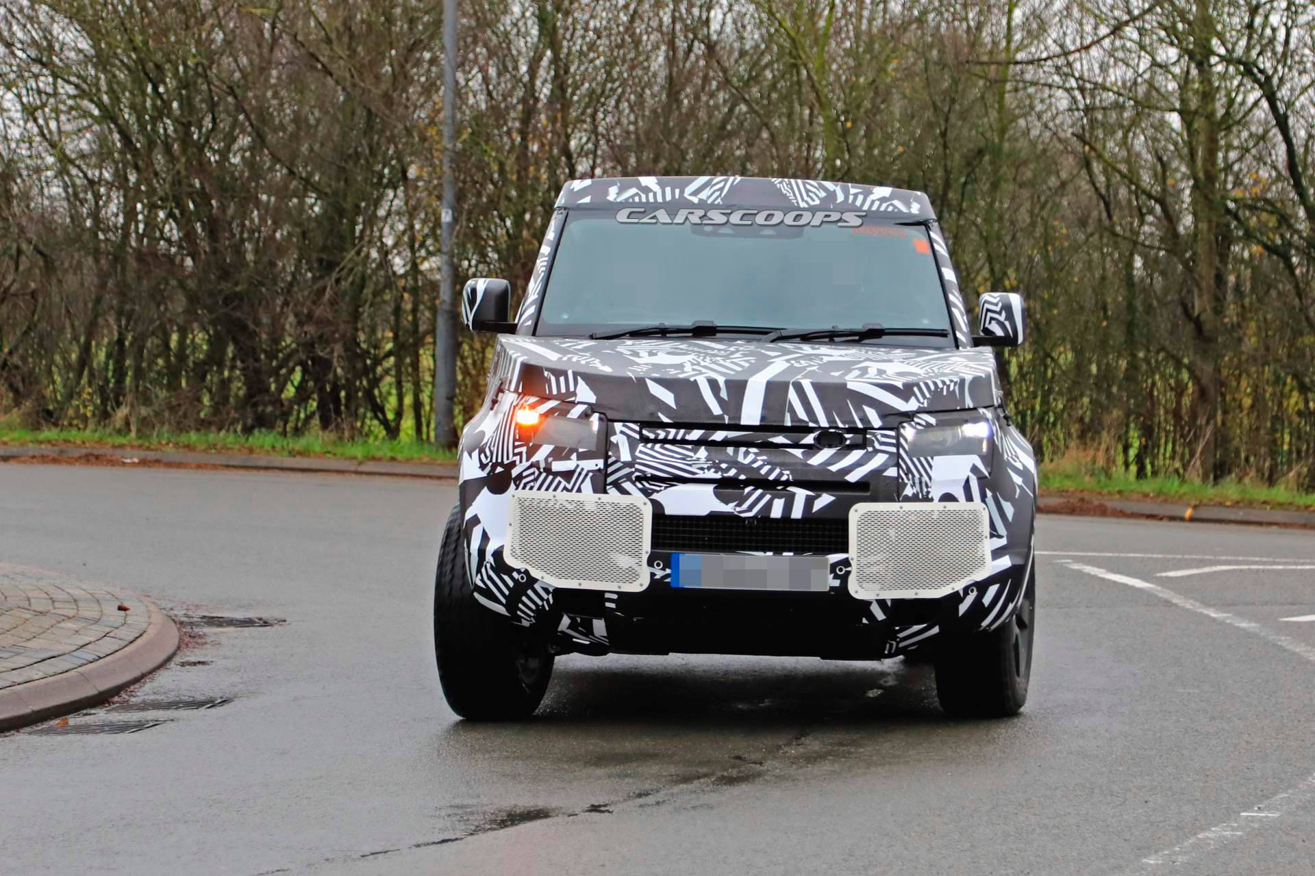 Kada je reč o dizajnu, novi Land Rover Defender ima kockastu karoseriju sa malom maskom (rešetkom) na prednjem delu koja ima horizontalnu “šipku”. Ispod nje vidimo novi branik i rešetke. Na mesto tih rešetki će se verovatno naći veliki usisnici za vazduh.