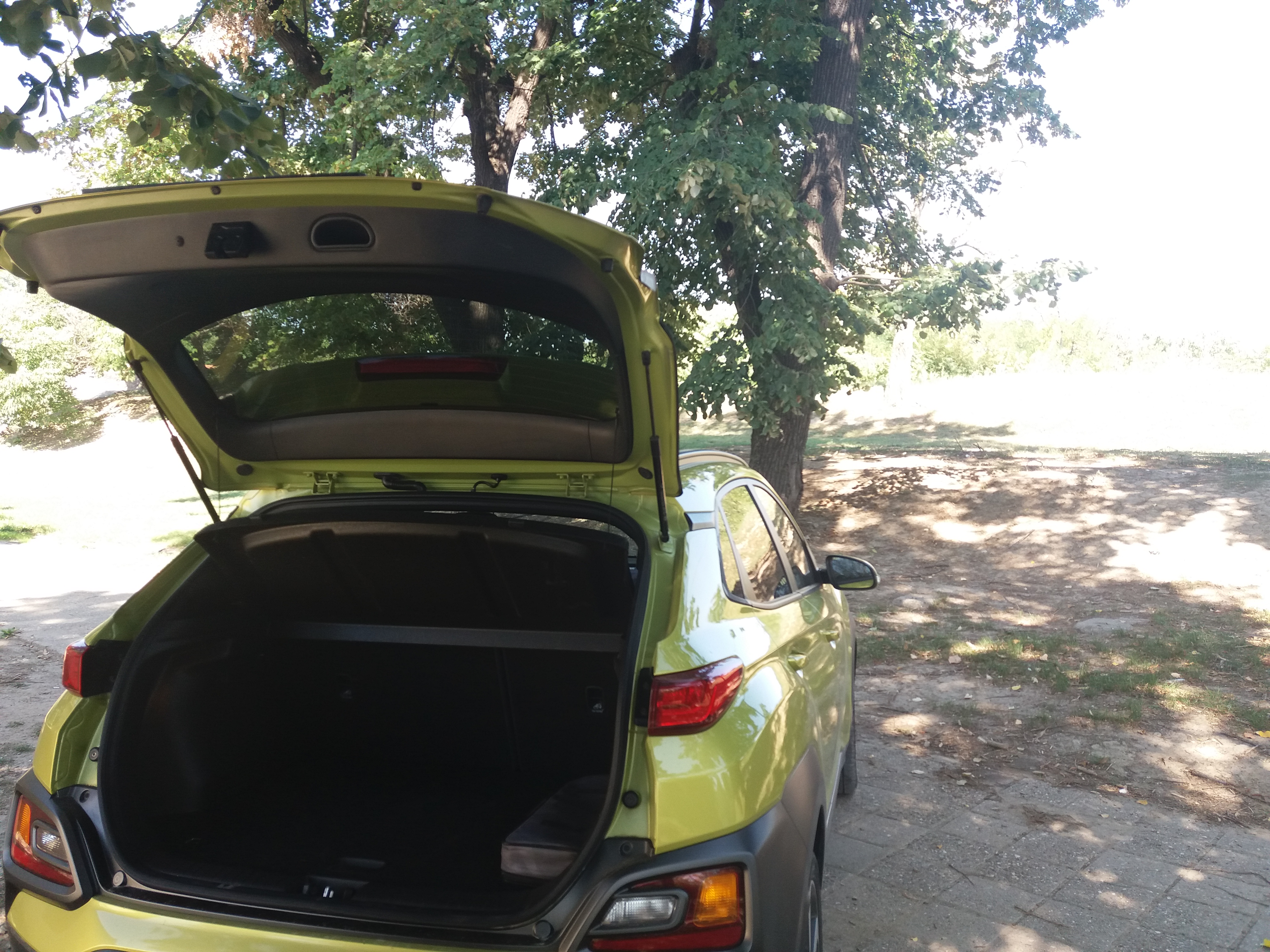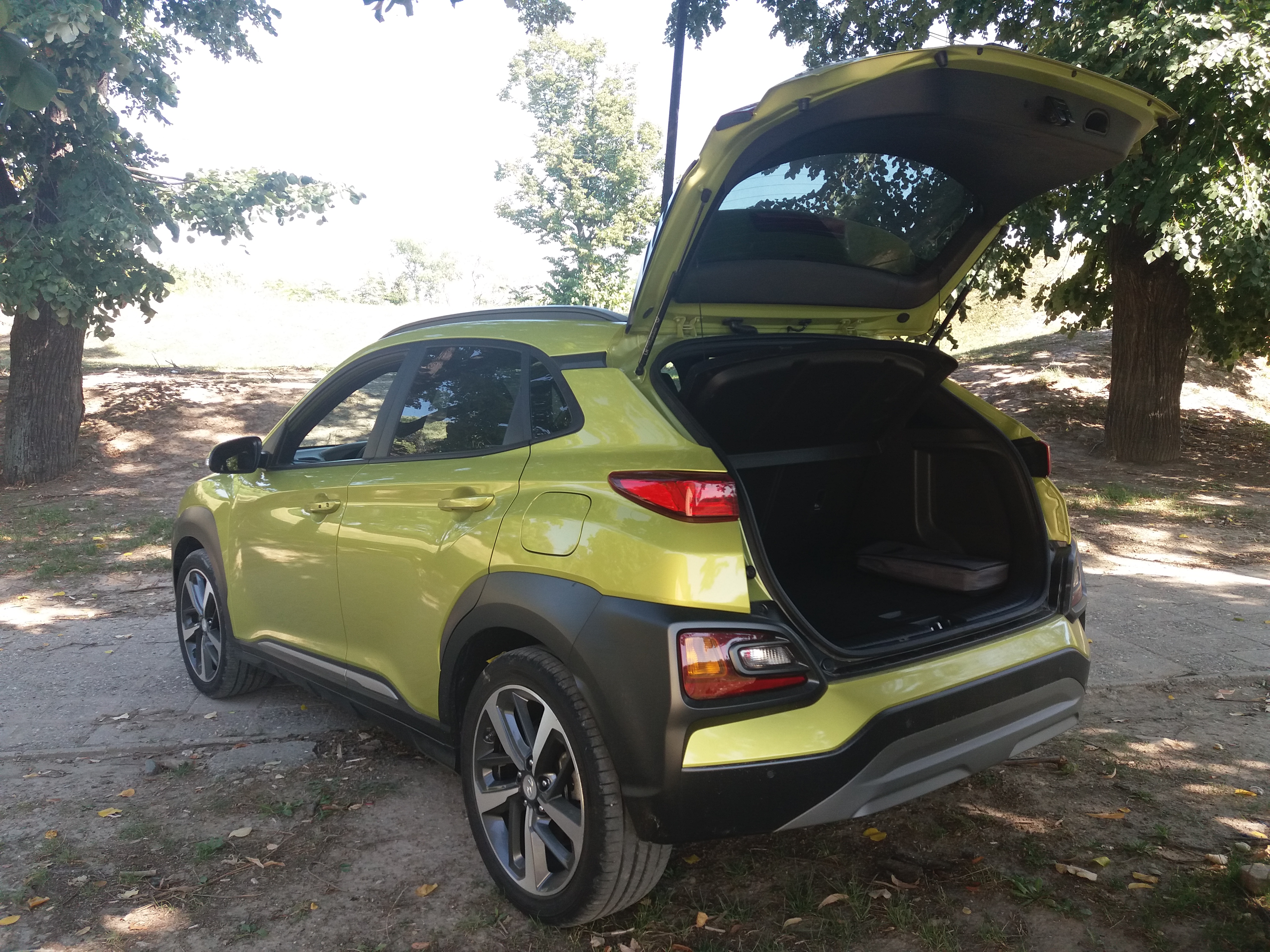 Led zadnje svetlosne grupe kao dodatak Ultimate paketu opreme, jedina su razlika u odnosu na pozadinu na koju smo već navikli i koja je možda najmanje zanimljiv ugao gledanja Kone. Ipak, više puta smo istakli da o ukusima za stražnjice ne treba raspravljati. Na to bi trebalo dodati i da je kapacitet prtljažnika ovde proširen pregradom u podu i sada iznosi za segment solidnih oko 540 litara. Standardni gepek kod Kone je inače mizernih 361 l. Spustite zadnja sedišta i dobijete skoro 1.300 litara korisnog tovarnog prostora. Uz to ćemo reći i da masa praznog vozila iznosi oko 1.400 kilograma što je takođe u skladu sa pomenutom konkurencijom.