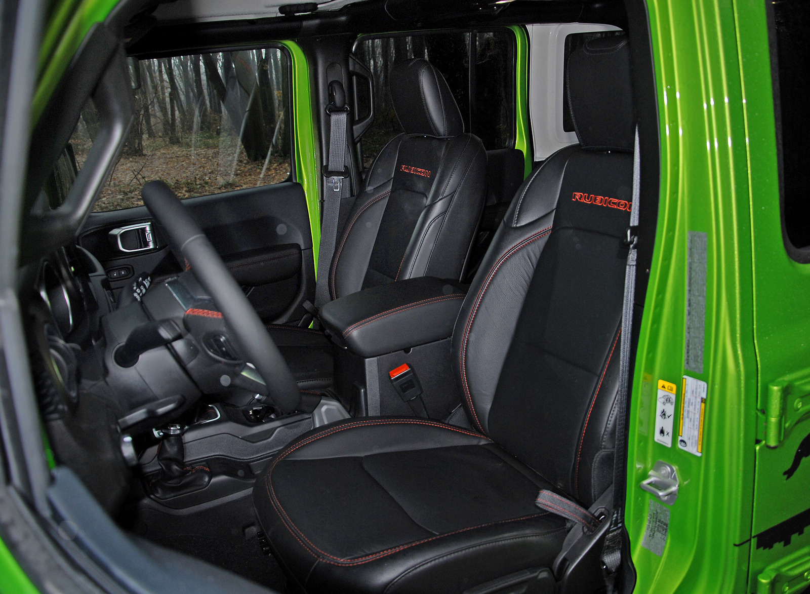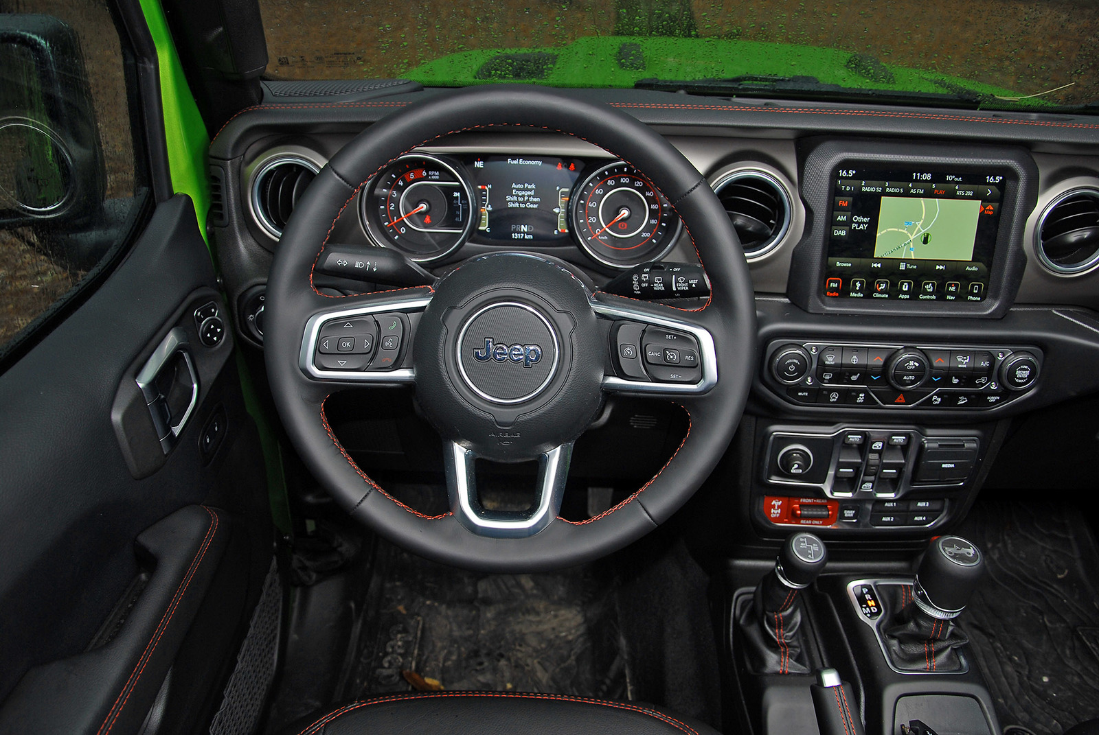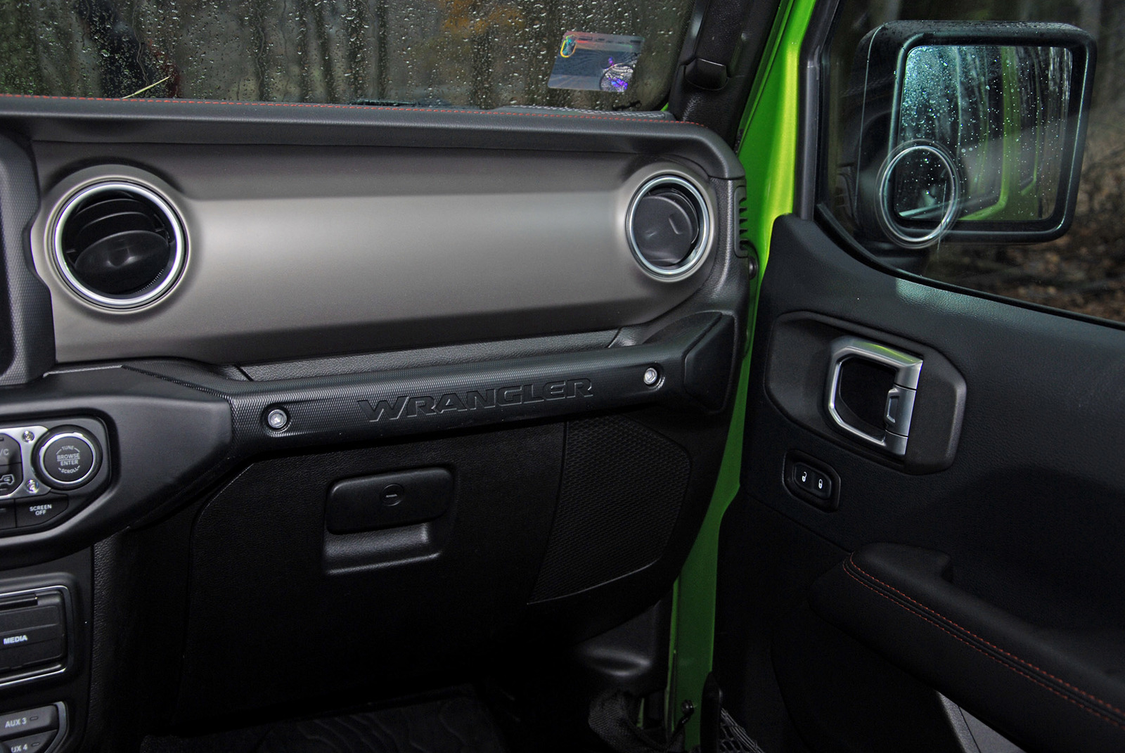 Iako je kabina na neki način ista, tačnije kockasta, sve ostalo je drugačije. Pogled odmah zastaje na potpuno novoj, za Wrangler nestvarno luksuznoj armaturnoj tabli u koju je smeštena dopadljiva i sasvim obična instrument tabla, 8-inčni displej infotejmenta i vrlo fino dizajnirane komande klimatizacije. Položaj podizača za stakla je ostao gde je i bio ranije, tik ispod monitora, što nalazim da je vrlo nepraktično i potpuno besmisleno jer ruka kreće sama instinktivno prema rukohvatu na vratima.